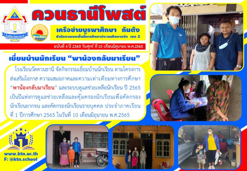 โรงเรียนวัดควนธานี จัดกิจกรรมเยี่ยมบ้านนักเรียน ตามโครงการส่งเสริมโอกาส ความเสมอภาคและความเท่าเทียมทางการศึกษา “พาน้องกลับมาเรียน” และระบบดูแลช่วยเหลือนักเรียน ปี 2565 เป็นปีแห่งการดูแลช่วยเหลือและคุ้มครองนักเรียนเพื่อคัดกรองนักเรียนยากจน และคัดกรองนักเรียนรายบุคคล ประจำภาคเรียน ที่ 1 ปีการศึกษา 2565 ในวันที่ 10 เดือนมิถุนายน พ.ศ.2565 |