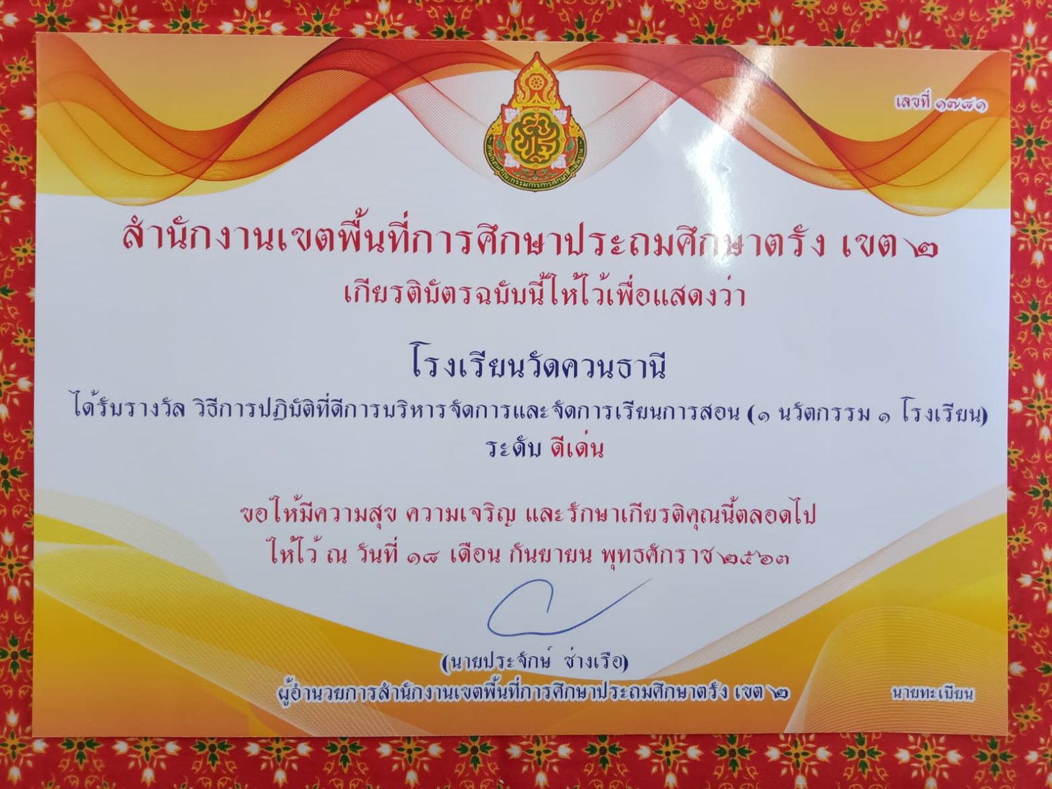 รางวัล วิธีการที่ดีการบริหารจัดการและจัดการเรียนการสอน (1 นวัตกรรม 1 โรงเรียน) ระดับ ดีเด่น